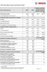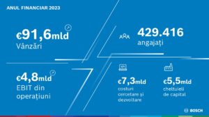În ultimul an financiar, Bosch a generat vânzări de 91,6 miliarde de euro, în ciuda condițiilor economice și de piață nefavorabile. Aceasta reprezintă o creștere de 3,8 procente sau una de 8 procente ajustată în funcție de cursul de schimb valutar. Veniturile din operațiuni înainte de dobânzi și taxe (EBIT) s-au ridicat la 4,8 miliarde de euro (2022: 3,8 miliarde de euro). La 5,3 procente, marja EBIT din operațiuni a fost cu 1 punct procentual mai mare decât anul precedent. A fost mai mare decât se preconiza, dar totuși mai mică decât marja-țintă de cel puțin 7 procente cerută pe termen lung. Bosch intenționează să atingă această cifră până în 2026. „Avem nevoie de un nivel ridicat de rentabilitate și putere financiară, astfel încât să ne putem autofinanța obiectivele de dezvoltare cât de mult posibil”, a declarat Markus Forschner, membru al consiliului de administrație și director financiar al Robert Bosch GmbH. „Un sprint final de succes a contribuit la îndeplinirea așteptărilor noastre, din 2023, în general. Cu toate acestea, anul financiar 2024 va fi cel puțin la fel de provocator ca 2023.”