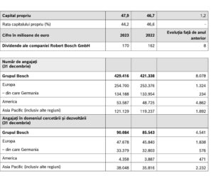 În timp ce nivelul stocurilor Bosch din anul precedent a fost încă puternic afectat de incertitudinile care au urmat pandemiei de Covid-19 și penuriei de cipuri, situația revine acum la normal. Ca urmare, fluxul de numerar disponibil s-a îmbunătățit, ajungând la 2,2 miliarde de euro. Constituind 2,4 procente din vânzări, acesta a depășit valoarea țintă minimă de 1 procent. Rata capitalului propriu a fost de 44,2 procente (2022: 46,6 procente). Cheltuielile pentru cercetare și dezvoltare au rămas stabile, la un nivel ridicat, de 7,3 miliarde de euro (2022: 7,2 miliarde de euro), rezultând o rată a activității de cercetare și dezvoltare de 8 la sută (2022: 8,2 procente). Cheltuielile de capital au atins un nou maxim de 5,5 miliarde de euro (2022: 4,9 miliarde de euro). După cum a subliniat Forschner: „Acordăm, de asemenea, o atenție deosebită eficienței costurilor investițiilor noastre inițiale, care au totalizat peste 12 miliarde de euro în 2023, și efectuăm ajustări pentru proiecte dacă este necesar”.