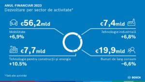 Stuttgart și Renningen, Germania – Grupul Bosch și-a mărit cifra vânzărilor și veniturile în 2023 și își implementează cu succes strategia de dezvoltare în ciuda unui mediu economic dificil. Prezentând cifrele anuale ale companiei, Stefan Hartung, președintele consiliului de administrație al Robert Bosch GmbH, a declarat: „În anul financiar 2023 ne-am atins obiectivele financiare și ne-am consolidat poziția pe piață într-o serie de domenii de activitate, de la semiconductori la sisteme integrate pentru clădiri. Vizăm inovații, parteneriate și achiziții pentru a ne asigura că ne dezvoltăm pe măsură ce industriile noastre se transformă, în ciuda dificultăților economice.” Pe termen lung, furnizorul de tehnologie și servicii dorește să atingă o creștere medie anuală între 6 și 8 procente, cu o marjă de cel puțin 7 procente. De asemenea, își propune să se claseze printre primii trei furnizori de pe piețele sale cheie din toate regiunile lumii.