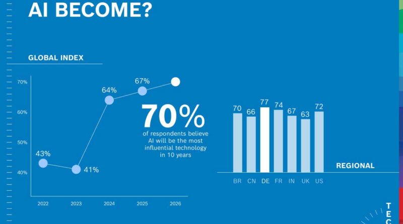 Tanja Rueckert, membru în consiliul de administrație și CDO al Robert Bosch GmbH, spune: „Vedem un număr de soluții inovatoare de IA în creștere rapidă la nivel mondial pe care nu le-am fi putut imagina nici acum câțiva ani. Prin urmare, nu este surprinzător că numărul persoanelor din întreaga lume care consideră IA cea mai influentă tehnologie a viitorului nostru a crescut vertiginos de la 41 la sută la 70 la sută în doar trei ani.”