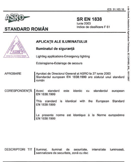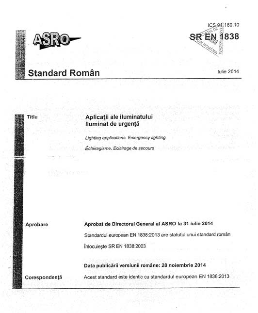 SR EN 1838 și ISO 3864 dar îndeplinește condițiile  de aparat de iluminat de urgență