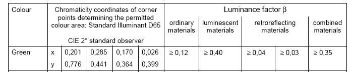 Din punct de vedere al culorilor permise, culoarea verde impusă de aceste standarde/norme are următoarele coordonate: