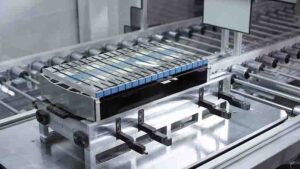 Close-up of an electric car battery module on the production line of an electric car factory.