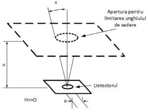 Schema exemplifică prezența diafragmei de limitare a câmpului de vedere, cu jumătate de unghi A, când distanța față de receptor este mare în raport cu diametrul detectorului.