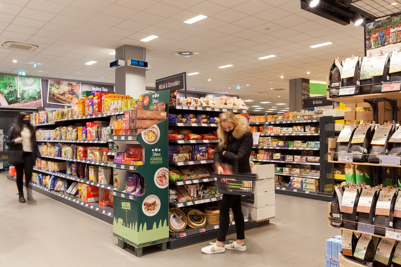 Corpurile de iluminat Philips pentru dezinfecție aer UV-C de la EDEKA Clausen sunt instalate la o înălțime de 3,2 până la 3,5 metri pe coloane și pereți. În plus, corpurile de iluminat Philips pentru dezinfecție UV-C sunt echipate cu ecranare și optică pentru a preveni expunerea la radiațiile UV-C, astfel încât angajații să poată umple rafturile în siguranță, în timp ce clienții își găsesc produsele alimentare.