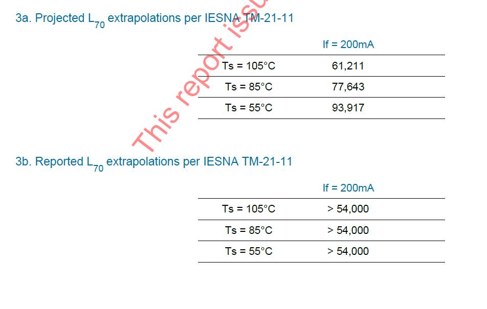 Este de remarcat în exemplul din Fig. 1, faptul că valorile raportate, L70 >54000 ore, au fost obținute prin extrapolarea valorilor măsurate pe o durată de 9000 ore (aproape un an de funcționare continuă) de 6 ori a acestei perioade, adică 54 000 ore. Prin aceasta extindere, se estimează evoluția (probabilă) după cele 9000 ore de testare, utilizând un model matematic specificat In standardele LM 80 și TM 21 („Proiecția menținerii pe termen lung a fluxului pentru LED-uri”) . Pentru aparatele de iluminat însă, a fost dezvoltat standardul SR EN 62722, care vine In sprijinul producătorilor unde sunt menționate cerințele specifice pentru aparatele de iluminat cu LED. Acest sprijin vine și ca o „derogare” de la timpul îndelungat de testare (luni de zile), dând posibilitate producătorilor să utilizeze, în anumite circumstanțe și valorile obținute de la LED-uri. Aceasta derogare Insă se aplică numai aparatelor care se încadrează în una din următoarele categorii/tip-uri: