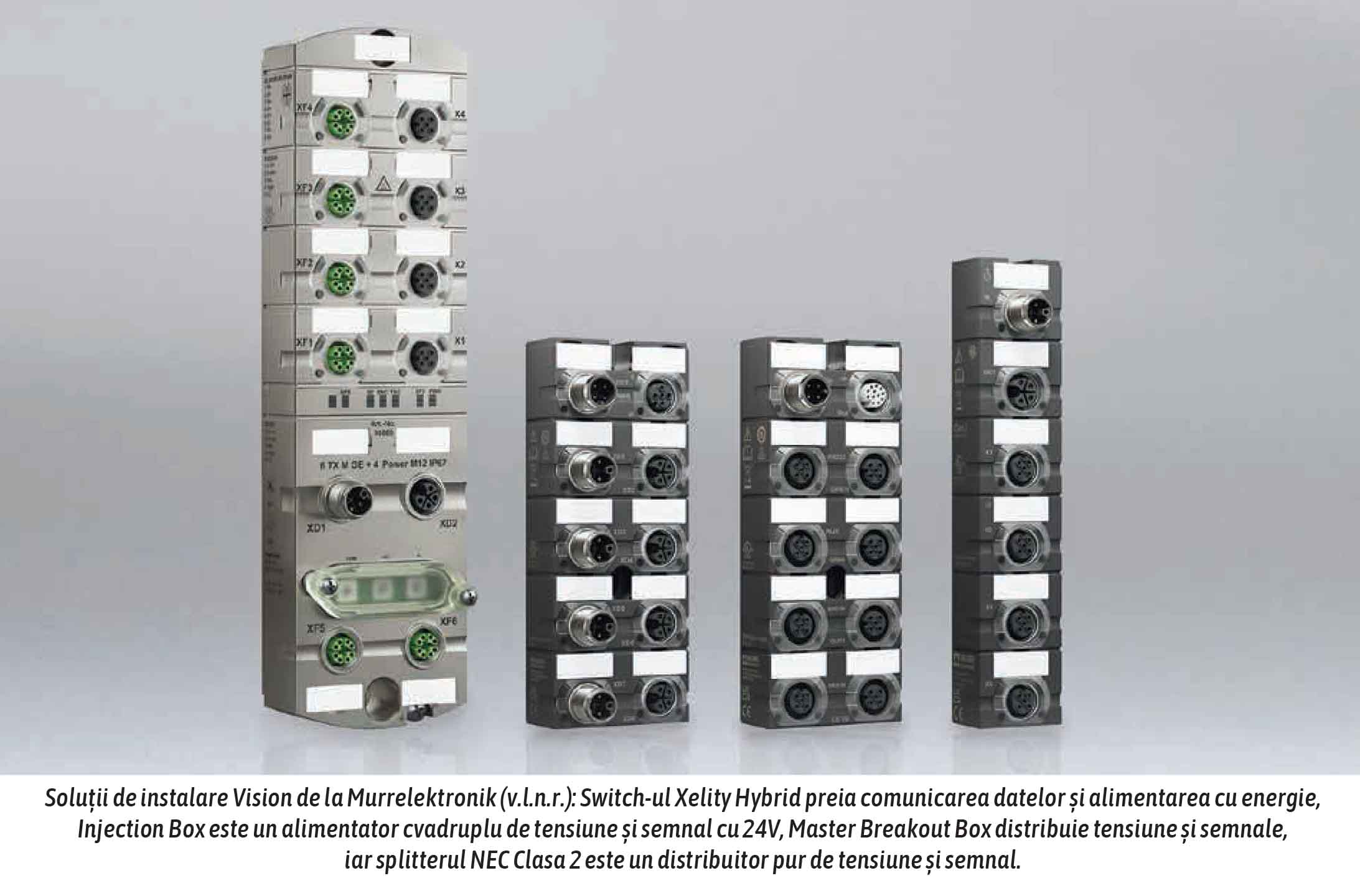 Printre aceste componente se numără Xelity Hybrid Switch, care asigură o comunicare de date fără dificultăți și fără erori și la care pot fi conectate până la patru camere, Master Breakout Box (distribuitor de tensiune și semnal), precum și Injection Box (alimentator de tensiune și semnal). Toate componentele sunt direct montate în câmpul utilajului, deci în imediata apropiere a fiecărui sistem Vision. „Conceptul nostru de instalare descentralizată are avantajul incontestabil de a-i scuti pe clienții noștri de o instalare costisitoare și consumatoare de timp în panoul de comandă“, spune Simon Schlichenmaier, Market Development Vision Systems la Murrelektronik. „Astfel, panourile de comandă pot fi mai mici“. Alt avantaj: cu soluțiile modulare Plug & Play de la Murrelektronik, sistemele Vision nu doar că se pun în funcțiune rapid și în mod flexibil – modulele simplifică și accelerează diagnoza funcțiilor în timpul funcționării.