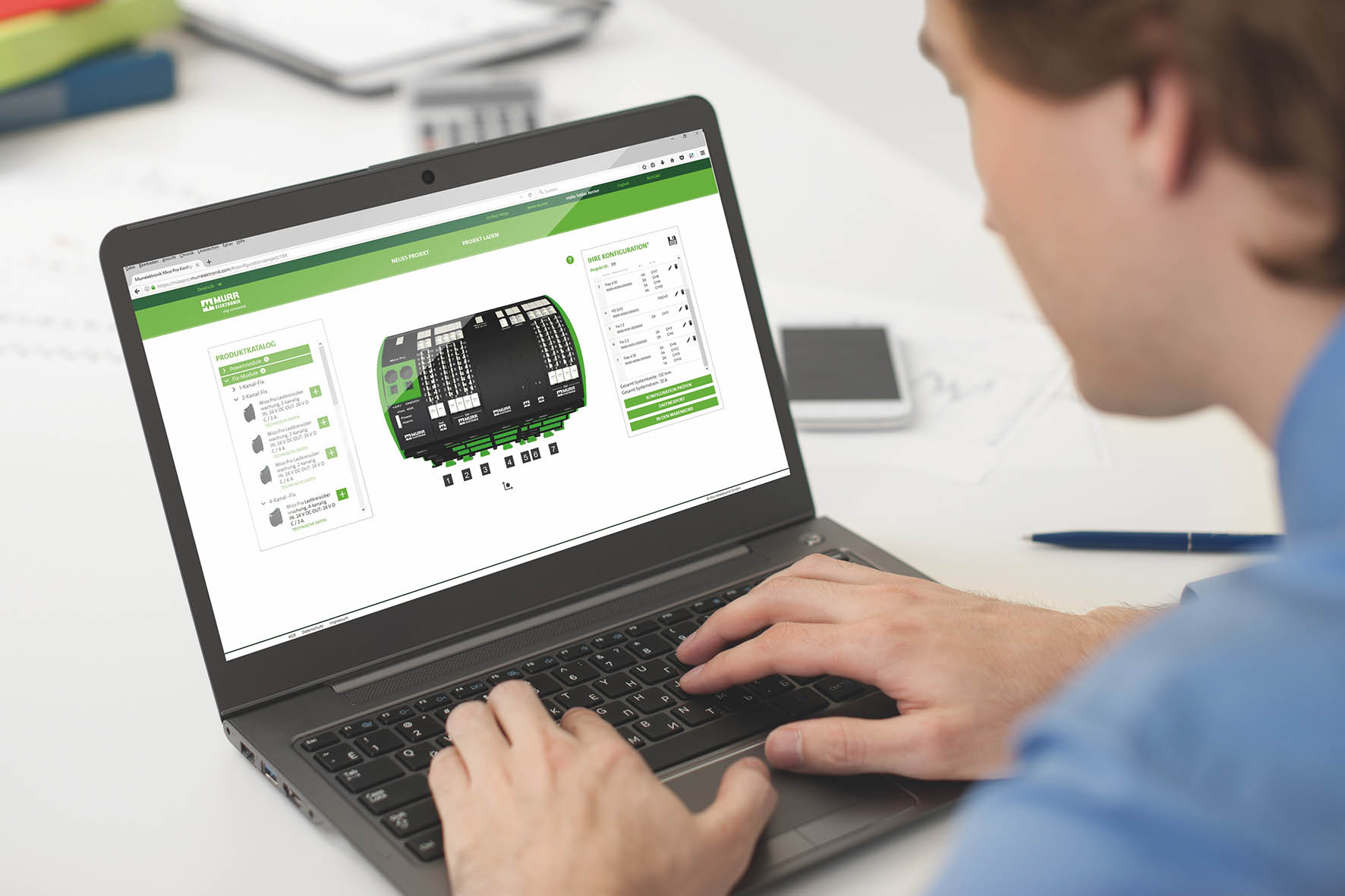 Pentru a facilita proiectantului sistemelor electrice alcătuirea sistemului modular, Murrelektronik oferă pe micopro.murrelektronik.com un configurator online confortabil. Cu câteva clicuri de mouse, acesta poate crea sistemul exact conform cerințelor, combinând modulul de alimentare și modulele Flex și Fix necesare. Proiectantul va primi nu doar o imagine 3D a unității sale Mico-Pro, ci și multe alte informații importante: Se calculează spațiul necesar, se indică curentul total important pentru selectarea alimentării electrice – și o verificare a plauzibilității exclude erorile de proiectare încă din aceste etape preliminare ale construcției.