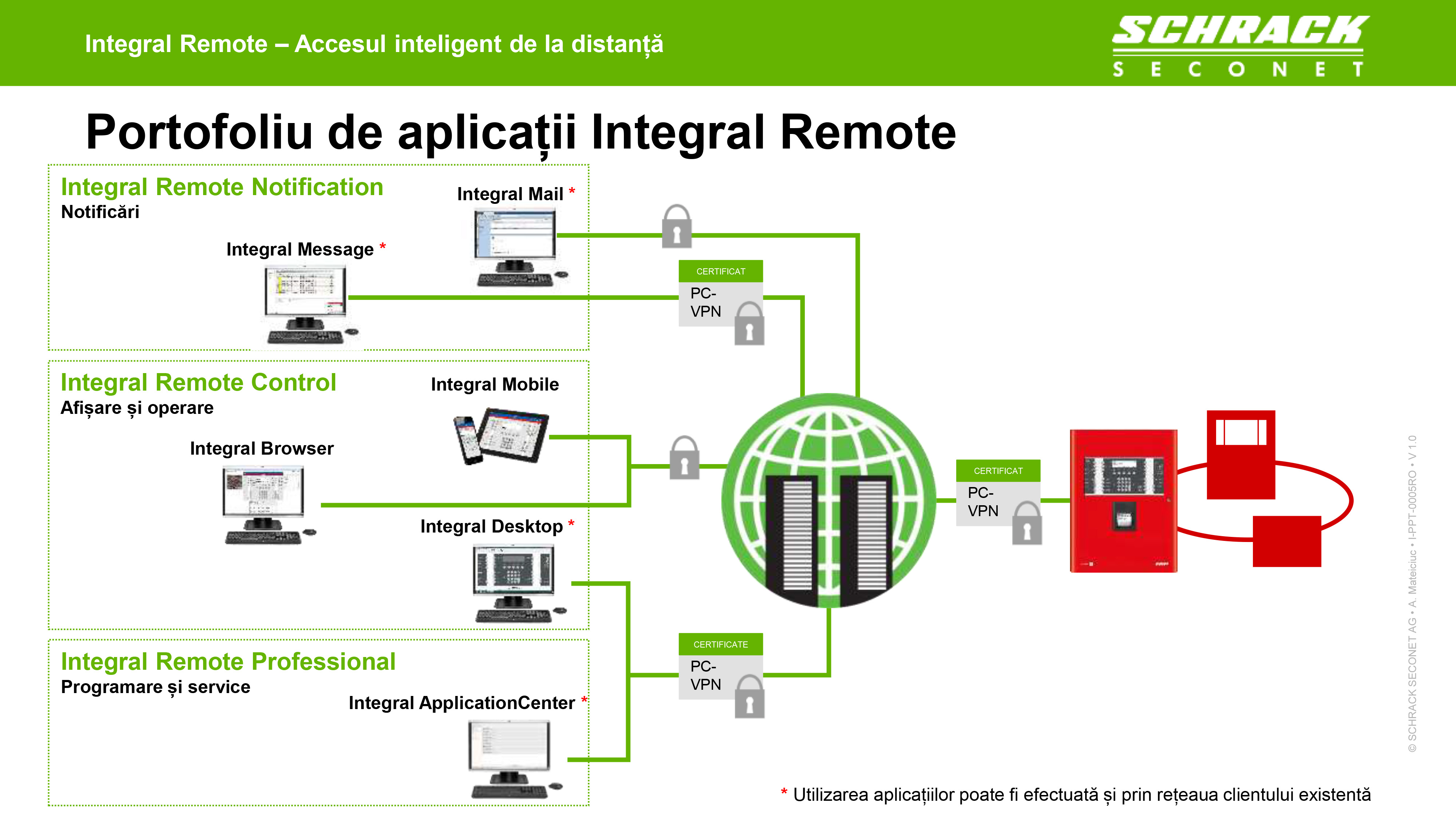 Integral Remote este setul de aplicații digitale pentru sistemele de detecție incendiu produse de Schrack Seconet. Acestea permit obținerea de informații sau operarea sistemelor de detecție incendiu prin intermediul dispozitivelor mobile sau al computerelor. Rămâneți conectat în orice moment, fără a vă deplasa la locație. Accesul de la distanță prin Integral Remote oferă o multitudine de soluții: