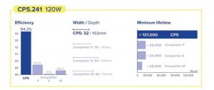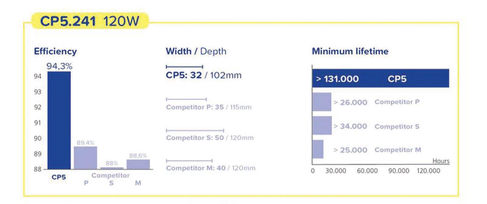 În clasa de putere 120W, sursele din Seria CP5 , modelele  CP5.121 (12V, 10A) și  CP5.241 (24V, 5A) setează noi valori de performanță. Cu o lățime de doar 32mm și o adâncime redusă de 102mm, CP5 este cea mai compactă sursă cu montare pe șină DIN din această clasă de performanță. Durata de viață a versiunii de 24V este de 166,000 ore, iar cea a versiunii de 12V ajunge la un minim de 110,000 ore – în ambele cazuri în condiții extreme de 230Vac, sarcină completă continuă și temperatură ambientală de + 40°C.